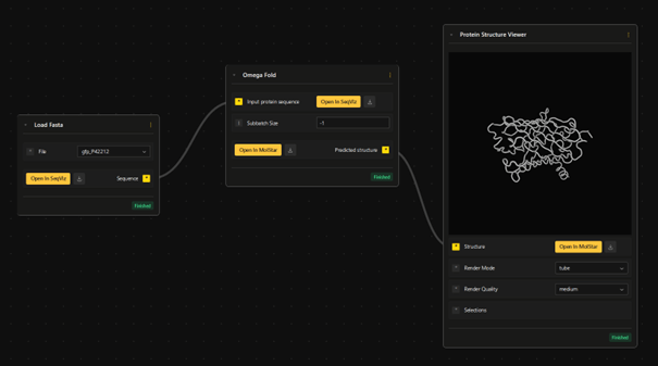 The loaded sequence is then forwarded to the OmegaFold-Node where a structure prediction is computed. The final structure is then piped into the “Protein Structure Viewer” again for a preview.