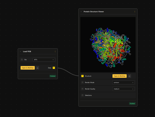 This simple pipeline loads in an uploaded .pdb file (you can see all the available .pdb files when clicking on the dropdown menu of the node).