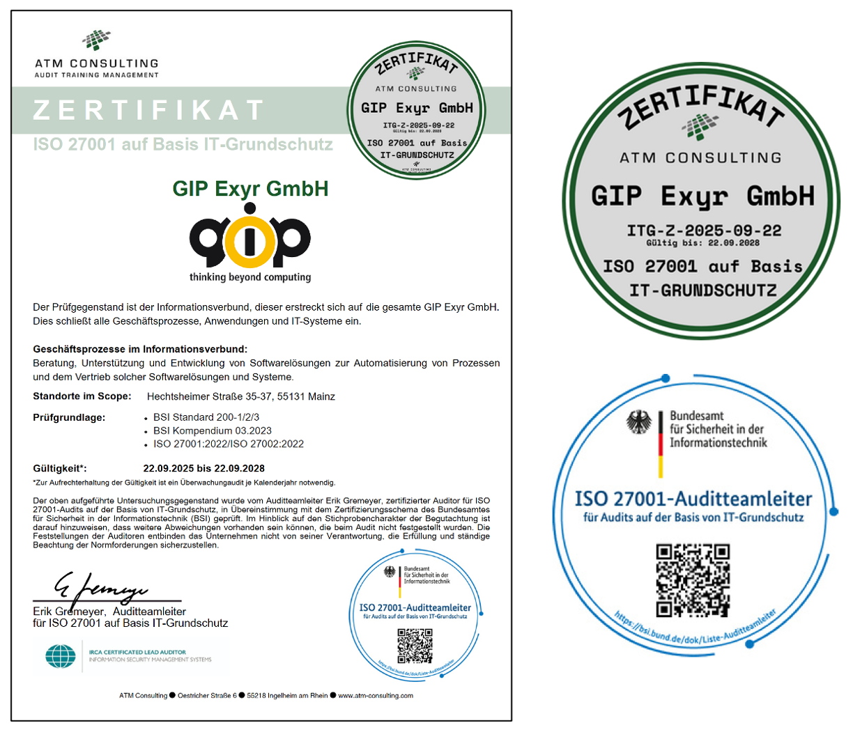 Und da schließt sich der Kreis hin zur eigentlichen Botschaft: die GIP Exyr GmbH ist seit Kurzem offiziell zertifiziert für ISO 27001 auf Basis BSI IT-Grundschutz. 🥳